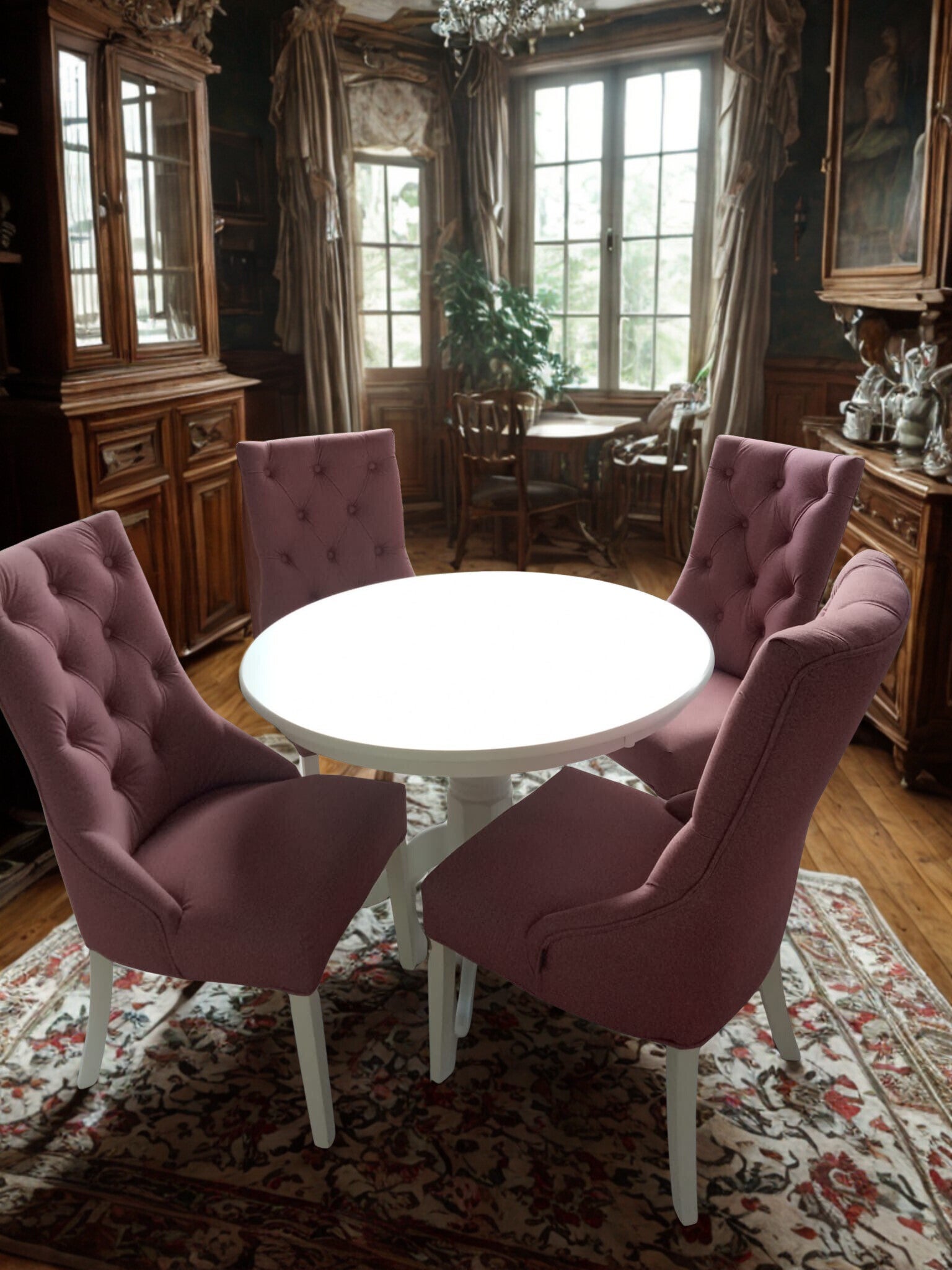 Die vier bequemen Polsterstühle überzeugen mit hochwertiger Chesterfield-Knöpfung – ein echter Stilakzent, der für Wohnkomfort und britische Eleganz steht.